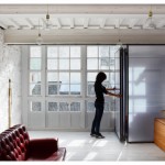 Planteamos desde el principio vaciar totalmente el piso, manteniendo únicamente la caja de escaleras central. conseguimos así un espacio único abierto, amplio, acotado a lo largo por una franja que alberga mueble-cocina-aseo-estudio-armario; es decir, una pieza longitudinal continua que recorre el piso y que contiene todas las necesidades, liberando el volumen y dotando de una continuidad tanto espacial como visual a la vivienda.