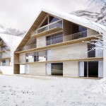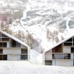 El resultado: dos volúmenes puros, contenidos, volcados hacia el valle y «autoprotegiéndose» de la carretera, con cubierta tradicional a dos aguas y situados en función del territorio, empleando básicamente dos materiales: piedra del entorno y madera de sus bosques. Cada uno de los dúplex del conjunto cuentan con magníficas vistas hacia el valle-río y la privacidad necesaria demandada por el cliente.