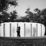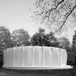 Reunirse al aire libre cerca de un estanque, a la sombra de los árboles. Sentarse bajo el cielo abierto, rodeado de aire disfrutando del entorno, integrándose en el lugar…y sin embargo el objeto propuesto necesita crear un lugar adecuado para utilizar como exposición. Se propone entonces una base neutra prácticamente exenta de mobiliario y obstáculos que acota en planta simplemente una porción del lugar y un elemento de cubrición de la misma resuelto con una membrana transparente hinchada que proporcione resguardo frente al sol y la lluvia pero no delimite, al menos visualmente, el espacio. Los materiales básicos dados se aprovechan para crear la mínima estructura necesaria que sustente a la fachada EFTE (etileno tetrafluoroetileno); se compone entonces un objeto cuasi inmaterial a los ojos del observador, pero capaz de generar sus propio espacio dentro del jardín y de cumplir los requisitos mínimos de confort exigidos en el programa. Desde el interior del pabellón, la vegetación percibe difuminada, el visitante se encuentra en una nube, un banco de niebla en medio del bosque.